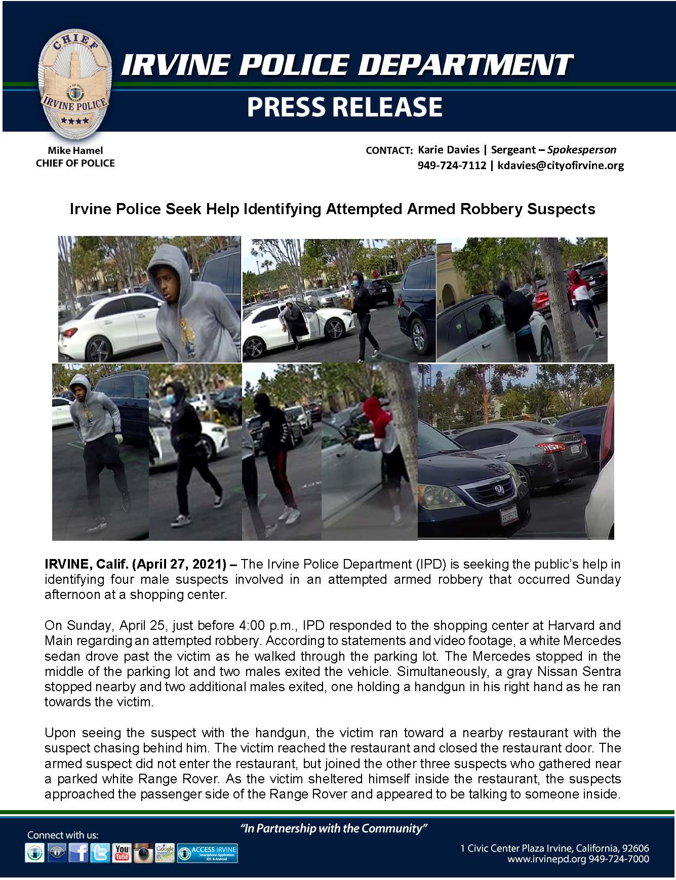 Our directed enforcement team (det) and specialized investigation unit (siu) focused on the area friday night to try to identify a suspect. Through excellent police work,. Webpolice announce that 34 burglaries took place over 35 days in irvine, which has claimed for 18 years to be the safest city of its size in the country. This morning, at about 6:21 a. m. , ipd responded to 55 fortuna. Webearly this morning, you may have noticed a large police presence in your area. The irvine police department (ipd) would like to provide you with information about the police. Webthe latest posts from @irvinepolice Webthe irvine police department is providing select crime data to city protect in order to display in a map format. Data provided includes criminal homicide, robbery, aggravated. A message from chief of police mike hamel: Welcome to the irvine police department (ipd) webpage. As you know, the city of irvine is a wonderful. Webuc irvine police department's goal is to provide the community with information about safety issues so that they may take appropriate and timely measures to take care of.
